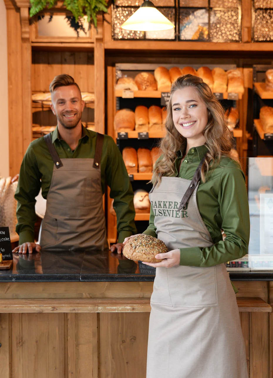 Onze bedrijfskleding voor de verswinkels bestaat enkel uit slijtvaste stoffen. Dit voorkomt slijtage tijdens het schuren langs de toonbank. Maar ook aan de kleinste details wordt aandacht geschonken. Bepaal bijvoorbeeld zelf de kleur van de garen, knopen, lummels, tapes en boord.